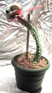 I also had a bunch of really cheap plastic plants that I cut apart so that I could use them as leaves on the stem. These were wired onto the spine just like the steel rod. Then the whole mess was liberally coated in fluorescent green spray paint. While that dried, I cut little wooden bases for the gummi skulls that would serve as heads. Holes were drilled into this to accommodate the steel rod in the spine of the backbones as well as to allow plug for the gummi skulls to be fed through. Then I painted them black and screwed them onto the partial skull bases on the spines. Easy peasy.