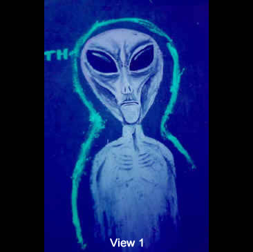 Glow paint is a bit tricky to work with because there are only a limited number of colors and it is really, really gooey and hard to blend. I recall using a lot of white to outline my concepts - particularly bodies and skeletons and so forth. The white tended to appear like purplish shadows, so it actually created an interesting effect. I was so pleased with the end result that I enlisted the aid of a photographer friend Steve Beier, we captured the "magnificence" of the maze. Digital photography was still in its infancy, so this required Steve to set up slow film in a camera on a tripod with a shutter open for 20 to 30 seconds. (You may want more detail on how he captured the images. You may be out of luck because photography isn't one of my hobbies and Steve has moved on to bigger and better things.)