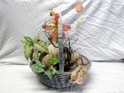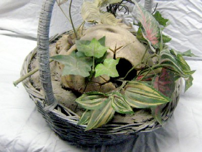 So I thought a nice simple skull with a huge whacking hole in the back of it would be more realistic. To have it buried in the earth in a basket with flowers thoughtfully planted around it (not to mention in it) would complete the effect. It was an easy one to make. The earth was made of liquid latex (my first adventure in this direction as I recall.) The most complex part for me was finding flowers I thought would look 'appropriate'. I wanted muted colors in oranges, reds, blacks and similar dark colors. Naturally I wanted a lily in the teeth as the pièce de résistance. One of the best things I found were the dead-looking black twig things. (I must confess, I do wonder what floral arrangers use such things for.)