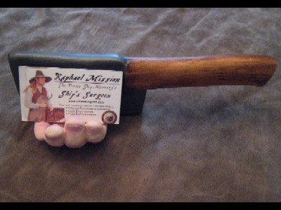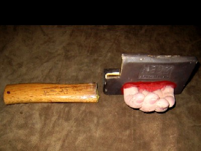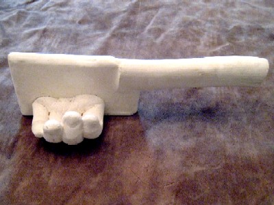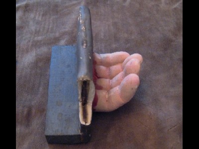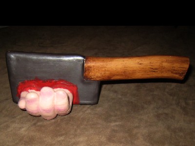 I made the original two prototype business card holders out of regular materials, just as I had don with a lot of the other HEDZ prototypes. The hatchet handles were actually wood handles I purchased at a hardware store. The axe was made of my favorite modeling material for creating semi-smooth surfaces: Model Magic molded around a piece of flat wood (to give the model magic strength.) Then I glued that to a block of wood in the back because the axe handle was so heavy a lever that the thing tended to want to topple over on it's side. The hand was made from a life-casting kit I purchased at a hobby store. Yes, that is actually my hand. Then I set it in the model magic and put our company logo in the back.