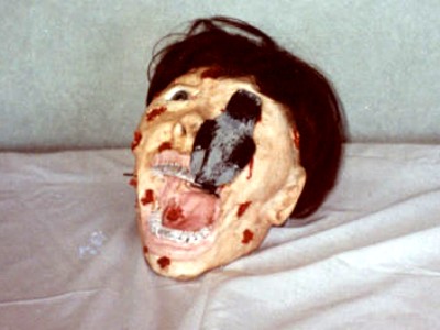 For the Birds was essentially a one-gag prop as created. I couldn't see recycling it over and over again each year. (If I'd have managed to re-create the jerky motion of a real bird, it might have been a different story.) It sort of sat around for a few years until I came up with another idea for a prop in late 1996. My friend Randy was working on an Asylum-themed house that year and I decided to make a half-body prop for him that represented a guy who had been shackled and then basically gutted. If that interests you, you can learn more about that prop on the page for Bob (opens in a new window). For Bob, I basically got rid of the wig, touched For the Birds up while making sure to preserve that wonderful, screaming face.
