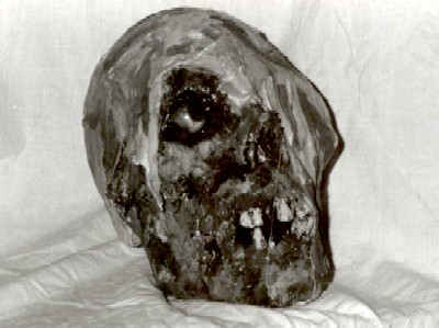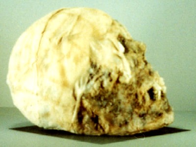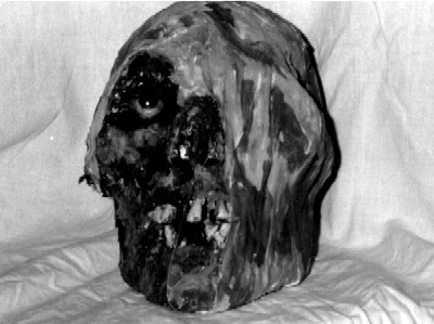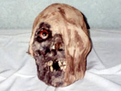 Creeops was one of the HEDZ designed for a Haunted House room built in the 1994 Wyandotte, Michigan Jaycess Haunted house. Unfortunately no photos were taken of that room - to my everlasting chagrin. (I liked the room.) It was designed like a 15' or so long corridor in a museum with 6 pedestals, 3 on each side. A large, half-body prop was featured at the end of the room on a special platform. Spot lights shown on each head. There were also humorous descriptions of each head. Of course, those have been lost as well. Ah, well. The scare was that one of the pedestals was hinged so someone could hide behind it. They were wearing a mask I had designed to look like the HEDZ.