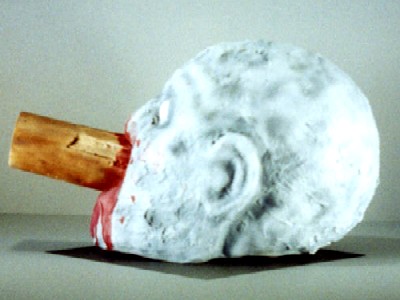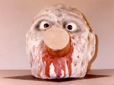 Since I had a pipe in mind when I created this particular prop, I used a piece of fence post when I created the initial piece. When I actually started considering the production cost of this particular HEDZ, I found out just how much round wood poles were! They were quite a bit more expensive than 2x4's. Not really needing the intruding object to be round for any particular reason, Shut Up! was re-sculpted using a 2x4 by the time he arrived at the 1996 Halloween Show in Chicago. Unfortunately for the flyer, which was done in advance of the pricing, the photos all showed the round wood post.