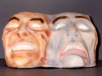 In keeping with what was most likely its inspiration, I made the left face look vicious and the right terrified. The primary reason for coming up with this design was to create a food dish that had two containers inside of it. I intentionally painted the left face in reds and oranges to suggest "hot" and the right face in blues and pale peaches to imply "cold". My basic concept here was that you could use it at a holiday party. MIld salsa could go into the blue one and spicy salsa in the red one. Or low fat candy could occupy the blue one and fattening chocolate the red one. You get the idea.