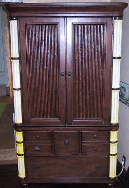 I spent months searching for much of the furniture used in this and other rooms. The entertainment center was one of those happy finds. I was looking for something that hinted at "pirate" that could also be closed up so the room wouldn't by marred by technology. Pirates didn't have much technology during the golden age, you know. So imagine my delight when I found this at the JC Penny outlet store. I knew it would be the perfect item, so I scoured the store in search of the best floor model they have (the ones I knew about then are now closed, but most of their furniture was floor models) The result is shown below.