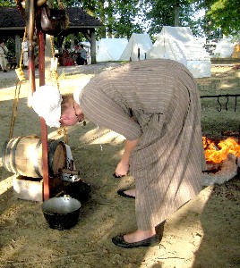 Paddling proved to be a most refreshing sport. Climbing out of the water, I don't even recall worrying about the damp - it was a nice feeling after being sweating in all those period clothes throughout the day. Not wanting to climb into the cloth seats of my truck in soaking clothing, I wandered over to the Thatcher's Mansion, where I found Silas to be a most accommodating host. (below left - A real pirate, Silas. Ok, I didn't take any photos of the night scene because I didn't want to have my camera sitting in wet pockets, but these photos accurately reflect the activity. Trust me.) As I sat there, mellowing out while I dried, Grace offered to give me a back scratch. Connie Thatcher explained that Grace was a champion back scratcher and foot massager. She has even developed her own finger limbering exercises to stay in shape for the sport (below right). Grace told me that she could keep scratching my back "all night without getting tired." (Well, until her parents made her go to bed, anyhow.) I got a good 15 minutes of it, which made me sleepy. So I bid everyone goodnight and went back to the hotel. I shudder to think what the wedding party members in the elevator with me thought of the drip-dried pirate guy. Ah, the heck with 'em.