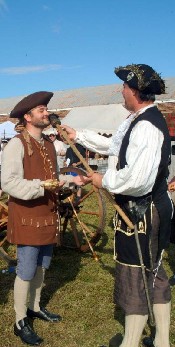 December 2nd, PM Today was pretty relaxed as far as events went. At least, it was so for Mission who does not, in fact, get hangovers, but does get sort of logy and listless the day after a night of extreme frivolity. It was my goal to get to fire the cannons during the battle today, which I did get to do. I had to switch sides to do it, which is actually entirely in character for my captured surgeon. So there. An outstanding local re-enactor named Mark showed me the ropes. First, you seal the touch hole on top of the cannon, then you put the charge in (those of you who know proper terms for these procedures, forgive me if I don't have them stated completely cricket.). You pack it down, then you prick it through the touch hole. You stick the fuse in and hook a fuse-pull (or string with a hook) to it. You then stand back and yank the pull cord when ordered to fire.