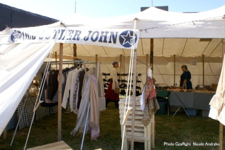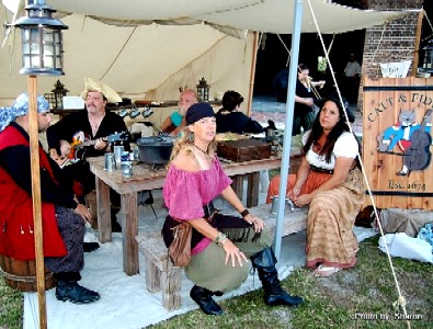 Above left: the ticket booth for obtaining entry into the fort, manned by the Bone Ilsand Buccaneers. Above right is the gateway the BI Buccaneers built for the vent. Below left is Bawdy Be's Beg -n- Barter shop. Below right is the Journal store featuring an assortment of hand-made journals. I got a really cool one with pressed flora in the pages to serve as my surgeon's journal. (Now I just need to come up with something to write in it.)