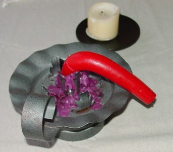 Above left: the Catt and Fiddle, an al fresco dining establishment courtesy of the Pirates of the Coast. That's Hurricane with the guitar and the yellow hat and Diosa at far right in the shot. Above right: the...uh..."sad" candle featured on the table at the C&F. That happened at some event and they kept it because they found it amusing. Below are some captured moments. From left: No Rum Charlie's transport, in the center is what I think looks like a cheap and painful way to get a vasectomy, at right is a wandering fort minstrel.