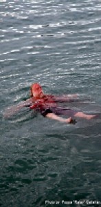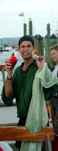 Above we have the saga of the prat from the Discovery Channel. He is trying to win so that he can do some TV show. First he threatened to shoot himself, which I don't see how that can be even remotely effective. Then he rips his parrot in half, which is just odd. Then he nonchalantly goes over the side. (Good riddance, prat.)