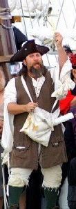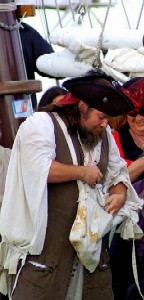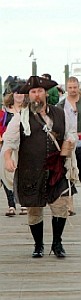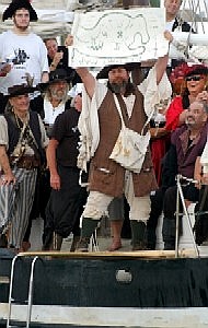 Below we have Captain Spike of the Bone Island Buccaneers dunking. It turns out that Spike was "too nice" to his crew, so they manacled him to a ball and chain to be walked off the plank. Spike appeared to be confused about directions on the plank, so he came back and beseeched the audience to listen to his proof that he was mean and vicious. As proof, he pulled a severed plastic pirate head from his pocket. You'll notice he wound up in the water.